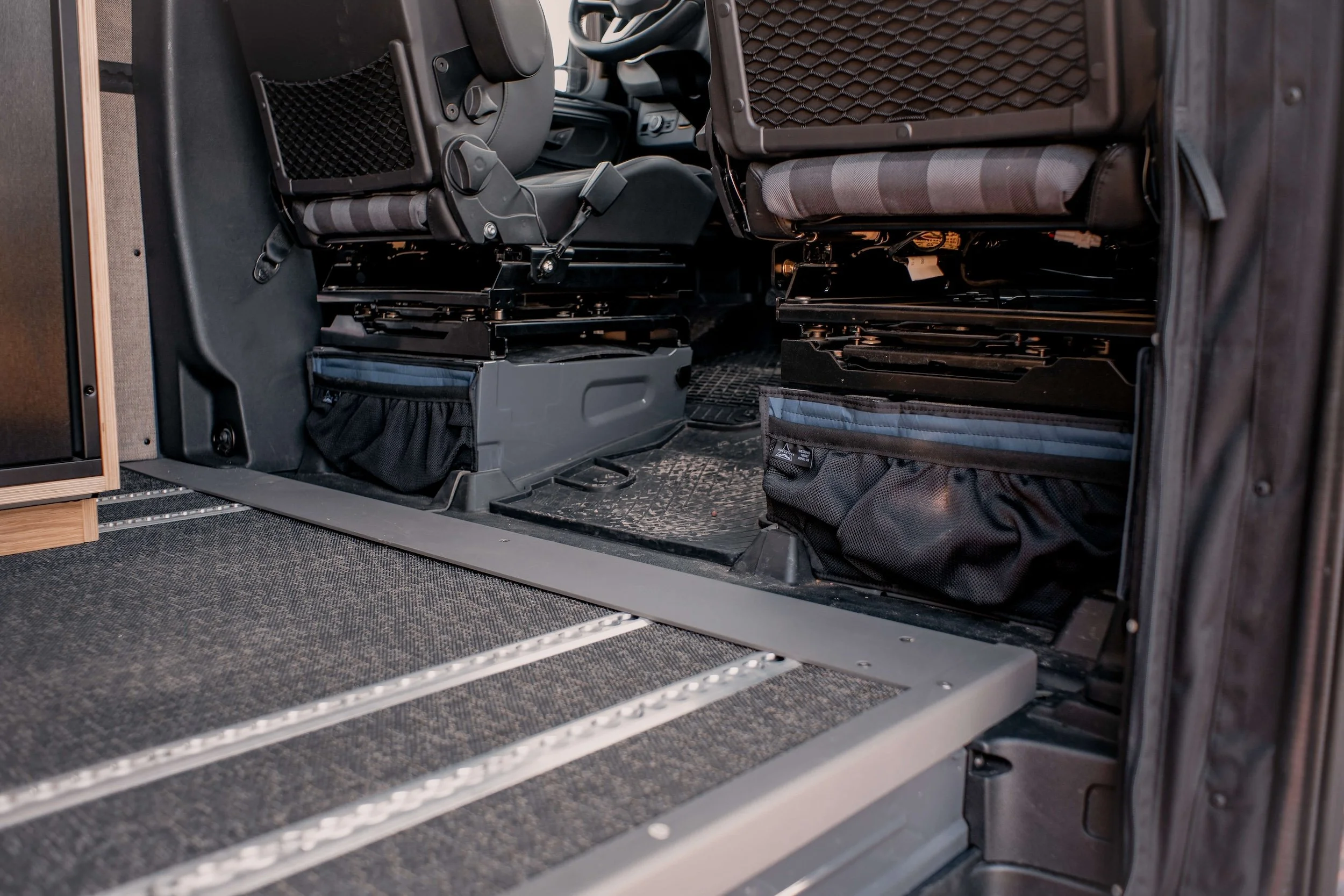 Exterior accessories feature favorites from Owl Vans—Pismo bumper with integrated Warn Winch, B2 Carrier and Expedition Box and a Ladder Tire Carrier combo. Lighting is critical so we use Baja Designs LP4’s mounted to a Flatline Van Co. Safari Rack along with a squadron package and slick under van scene lighting. GREY LADY is tuned to handle all road conditions, riding on 18” Method Wheels and 18” BFG KO2’s with a VanCompass Stage 4.3 adjustable suspension system.