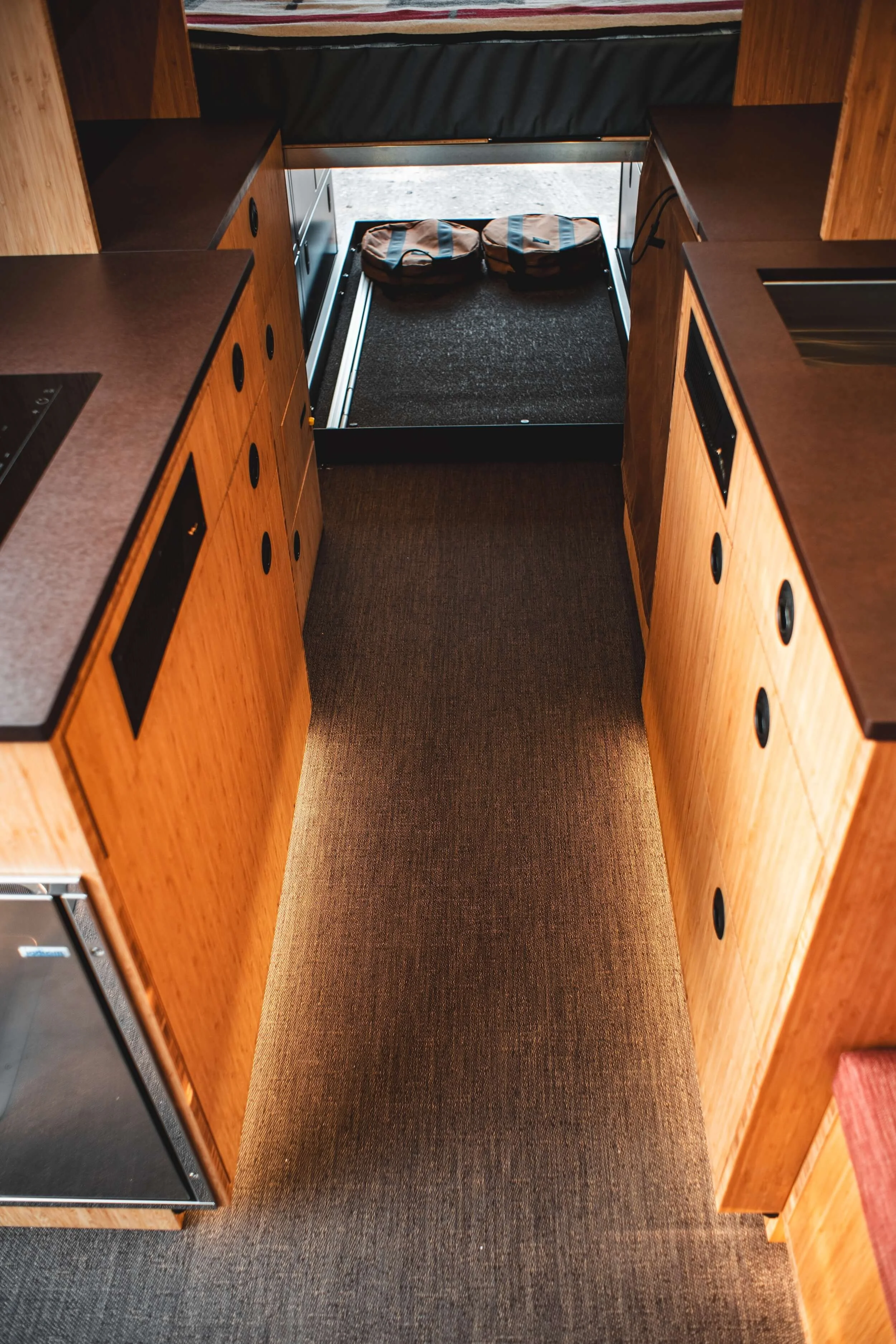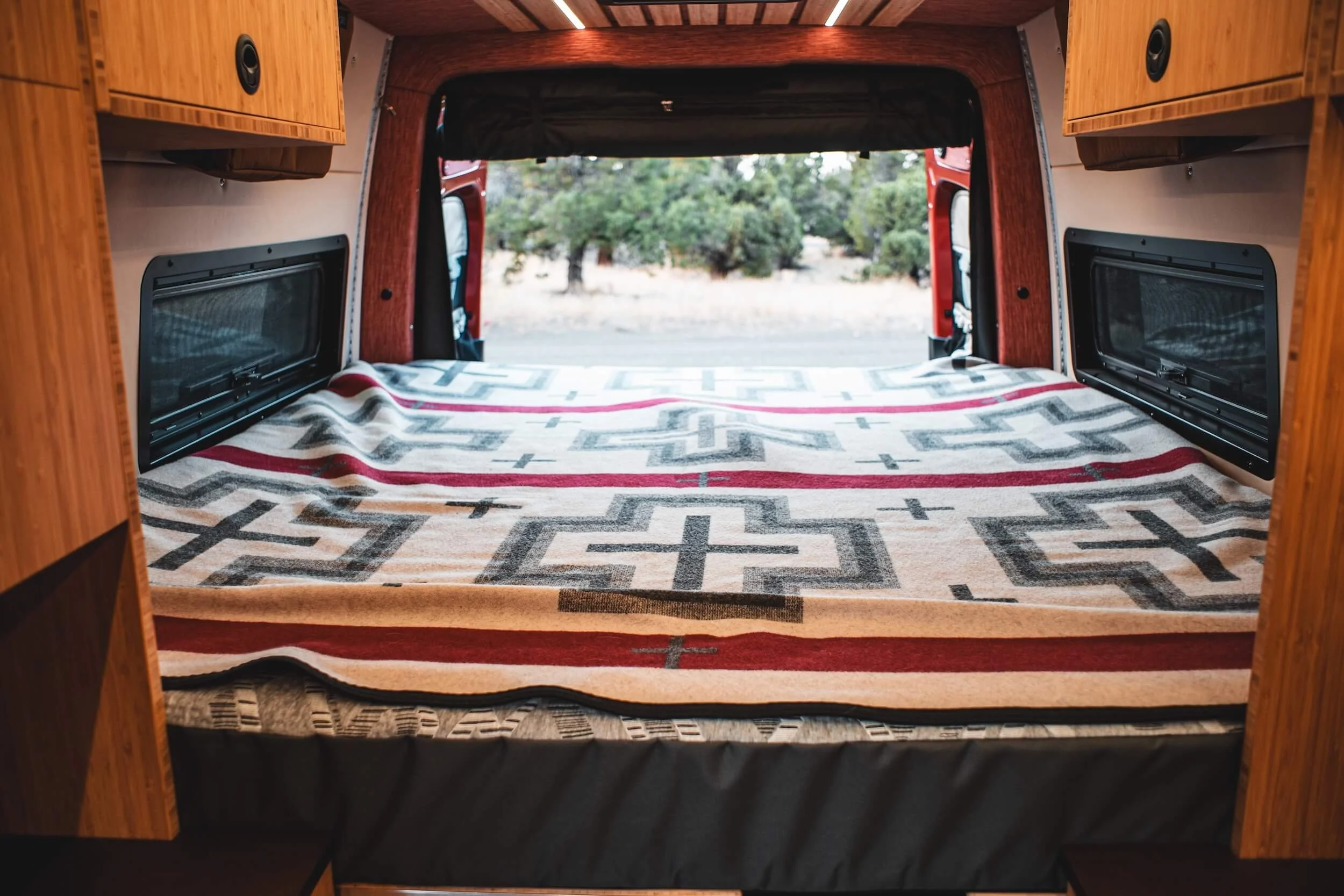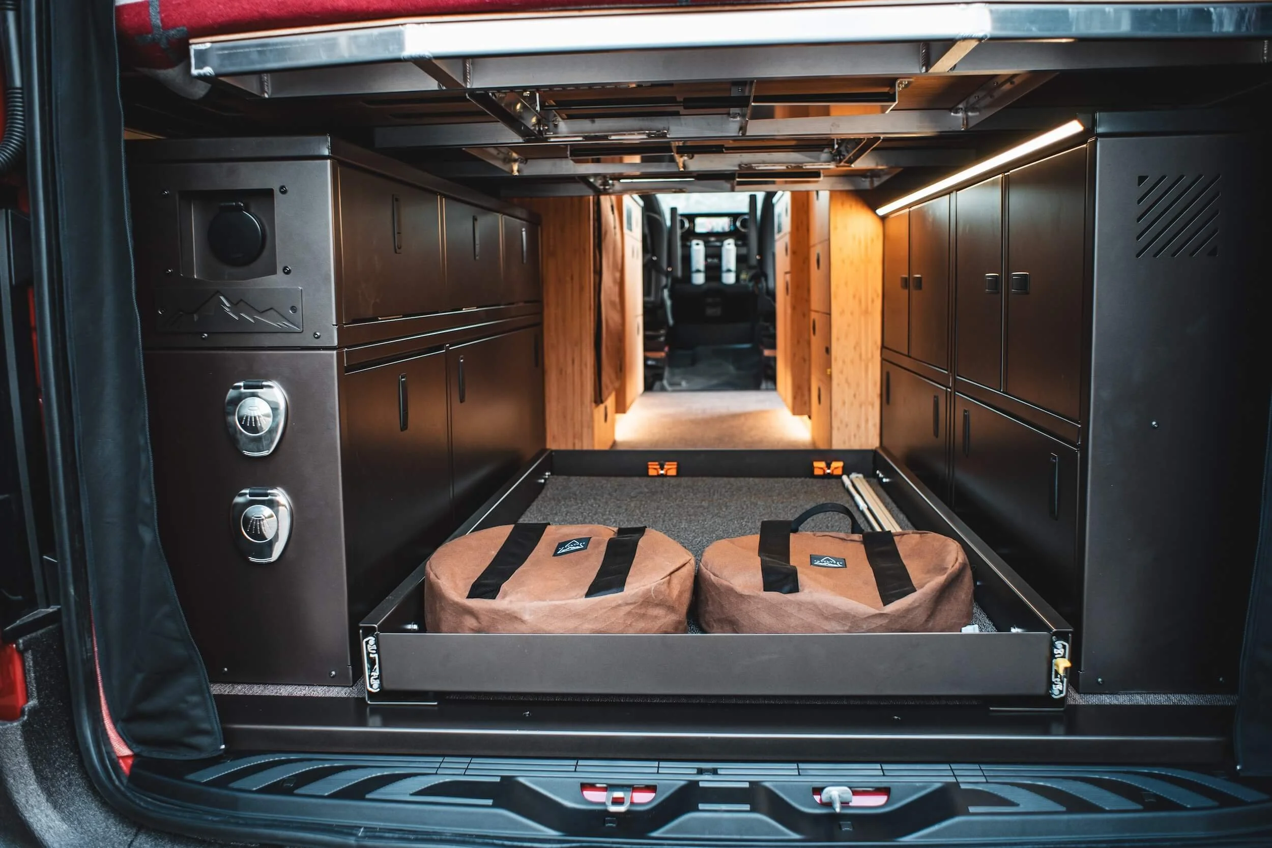 Fully custom inside and out starting with the perfect shades of bronze pulled from the Black Rhino wheels, extended to the LineX paint protector and a custom topographic wrap featuring peaks from their backyard in the Chugach mountains of Anchorage, AK. The warm bamboo interior cabinetry is calm and neutral, playing perfectly with the ivory Sileather walls and woven red tones of Nassimi fabric on the ceiling and trim. 2Tec2 woven flooring in bronze anchors the floor throughout the van and Richlite countertops and accent panels ground the space—all materials selected for their durability, functionality and aesthetics.
